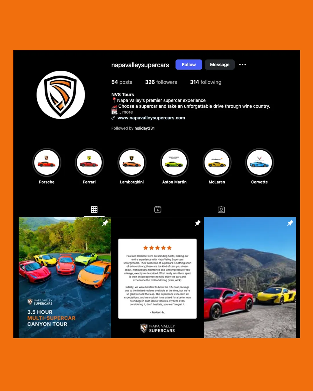Project Description: Our goal with Napa Valley was to raise awareness on social media – Primarily Instagram and Facebook. We also managed their paid META ads to increase clicks to their website booking page and follows on their social media pages.